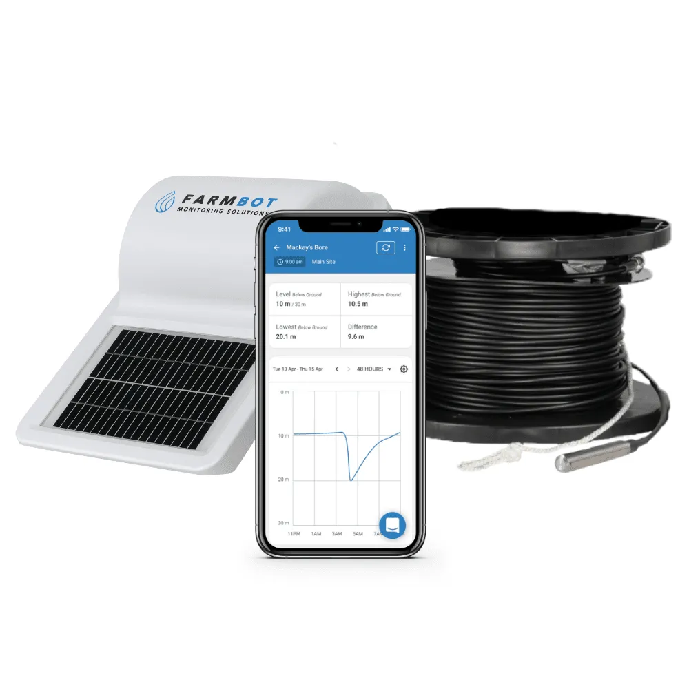 Farmbot’s Bore Level Sensor helps you monitor your underground water supply, detect pump issues, and reduce the risk of over-pumping. Track drawdown levels and trends to maintain bore health and manage water sustainably across your property.