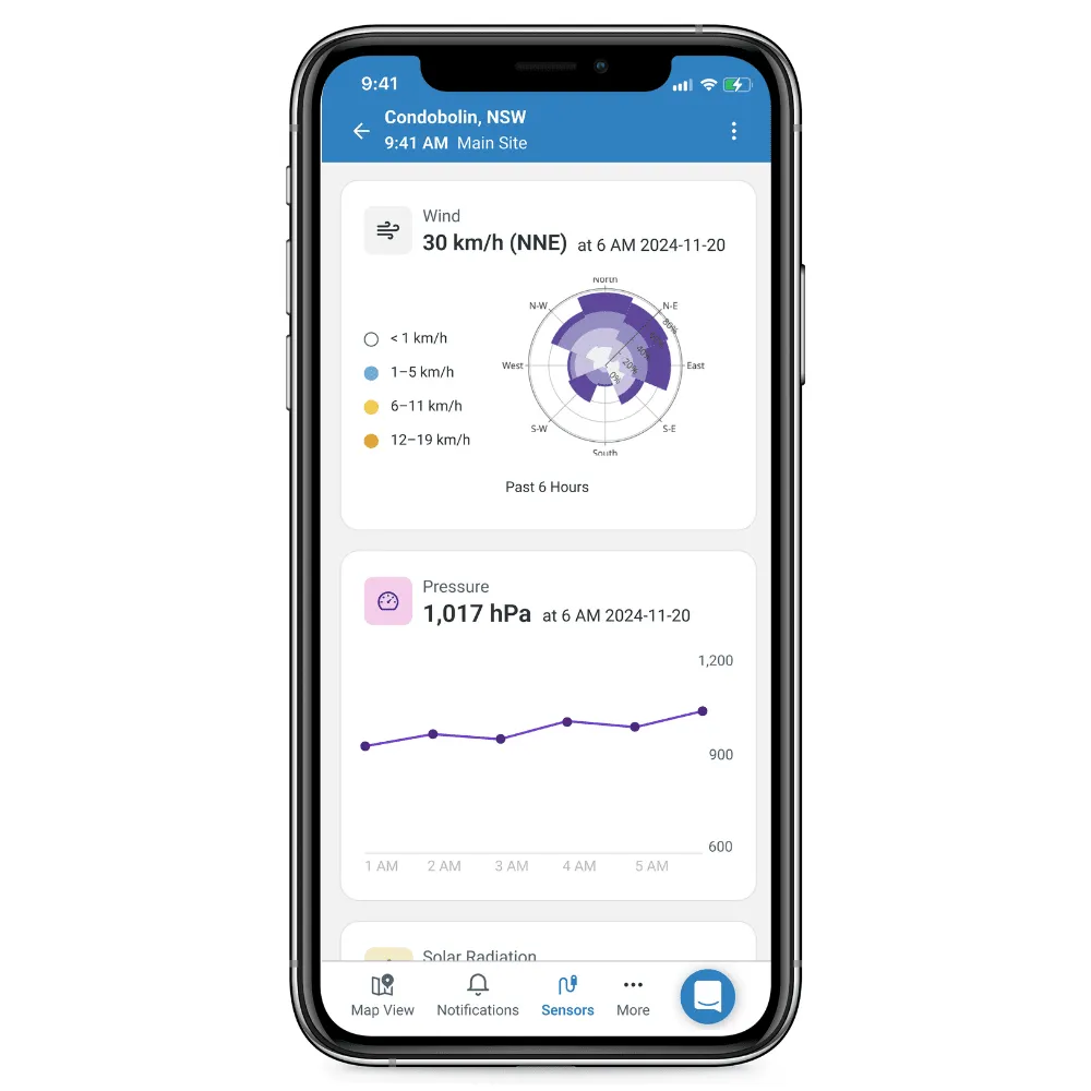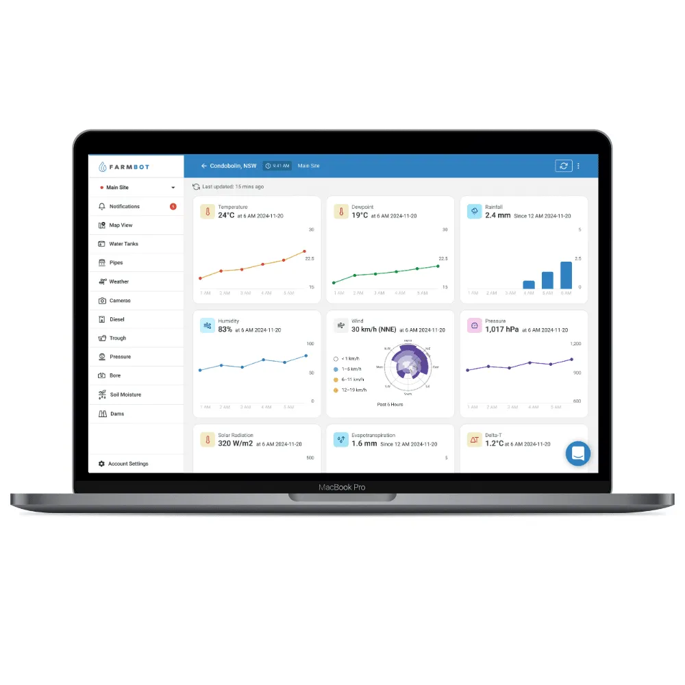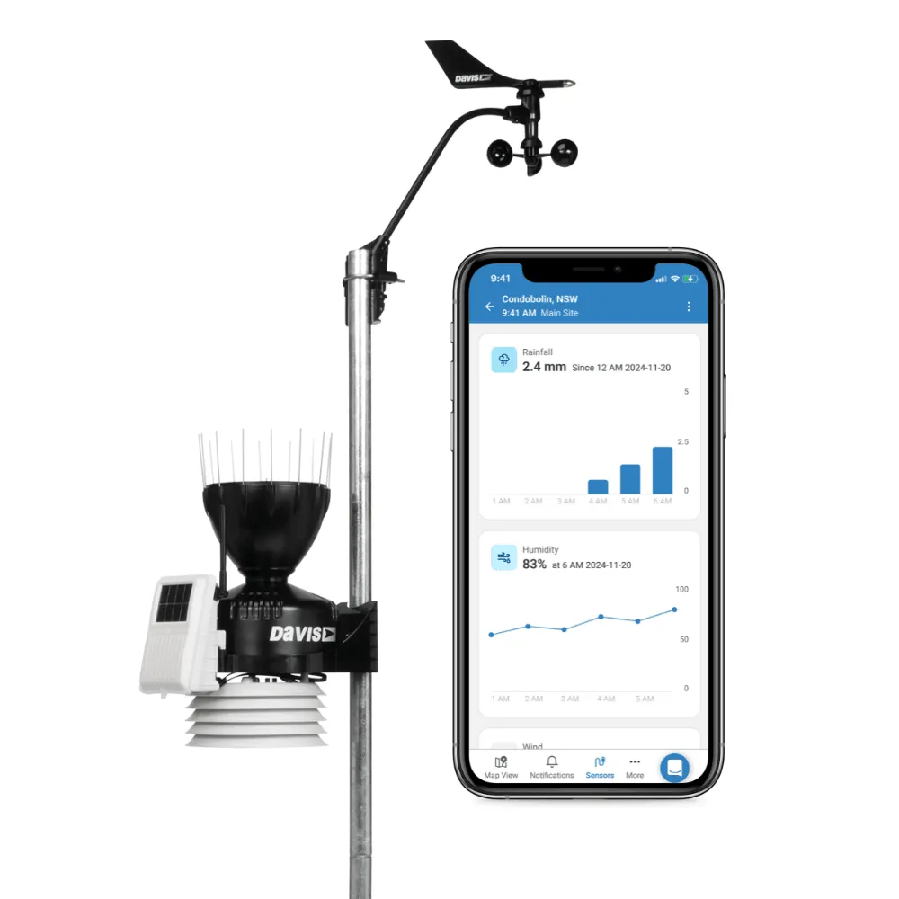 The Farmbot-integrated Davis Weather Station Vantage Pro 2 delivers comprehensive, reliable weather data directly to your MyFarmbot dashboard via satellite or cellular connectivity. Perfect for remote and off-grid properties, it captures key metrics like rainfall, temperature, humidity, wind, and more, helping you make informed decisions for livestock, cropping, and grazing.