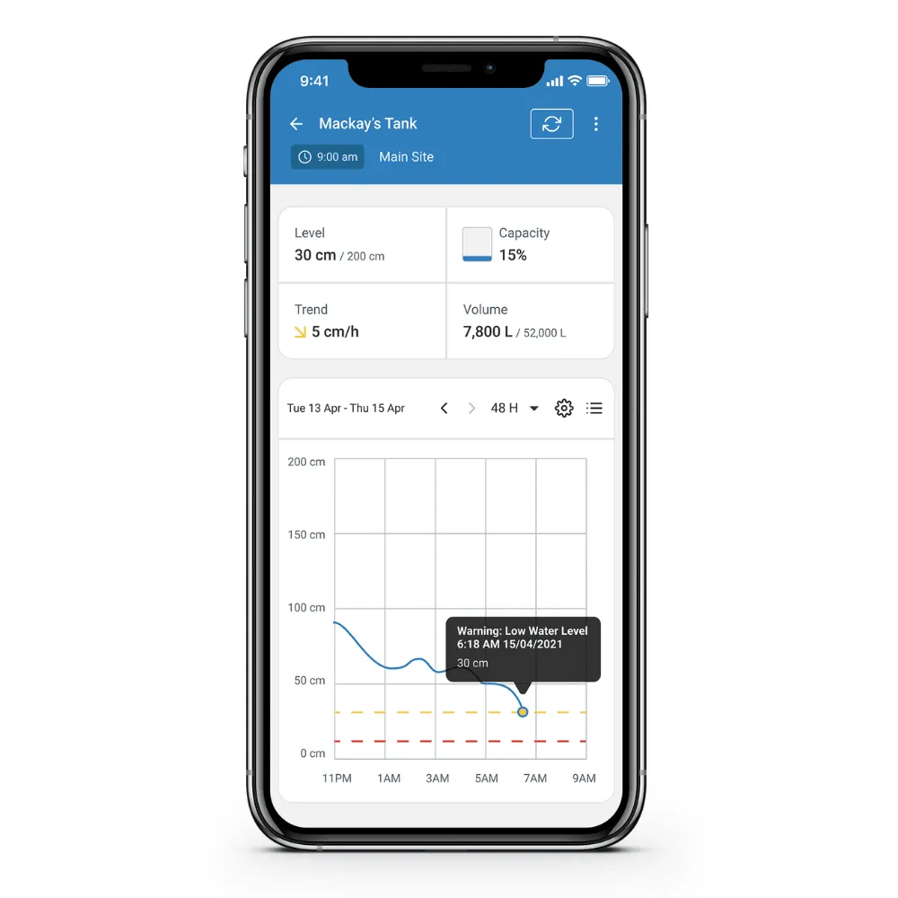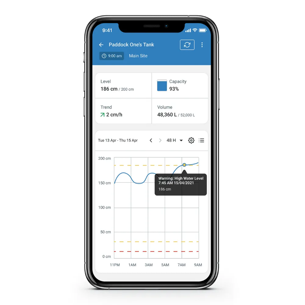 Farmbot’s Water Tank Level Sensor gives you near real-time visibility over your tank levels—anytime, anywhere. Receive instant alerts via SMS or email when levels drop, rise or fall rapidly, helping you act fast and save time, fuel and labour. Make better decisions with accurate data at your fingertips.